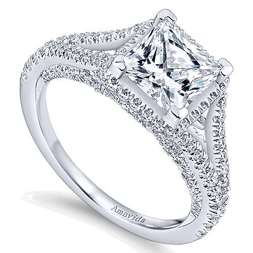 Bright pave diamonds line the gallery and split shank band of this alluring engagement ring. An unconventional halo lines the perimeter of the princess cut center stone.