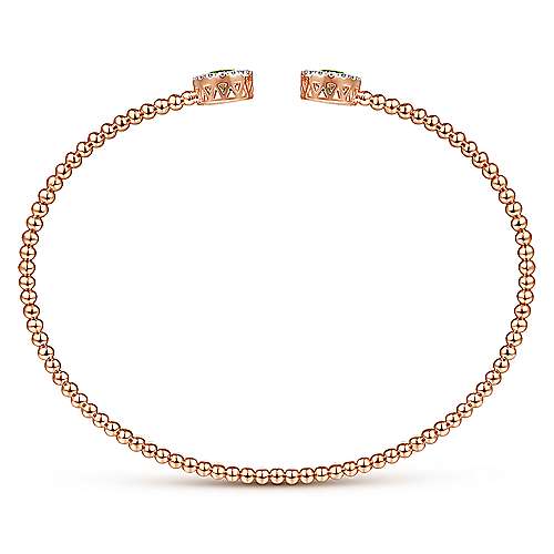 Delicate bujukan beading encompass the foundation of this flirtatious 14K rose gold bangle. With minimal styling, the small bujukan beads lead the design to beautiful yellow/green tones of peridot gemstones. Adding even more radiance, are 0.15 ct diamond halos that encompass the chartreuse colors of peridot.